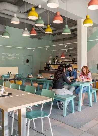 Statt ikonischer Berliner Monumente verknüpft das Konzept die vibrierende, nachbarschaftliche Atmosphäre der Berliner Kieze mit einer modernen, durch die CI-Farben der Meininger Hotels geprägten Raumwirkung. Große Wandgrafiken zonieren die Bereiche und spiegeln markante Orte der einzelnen Kieze wieder.